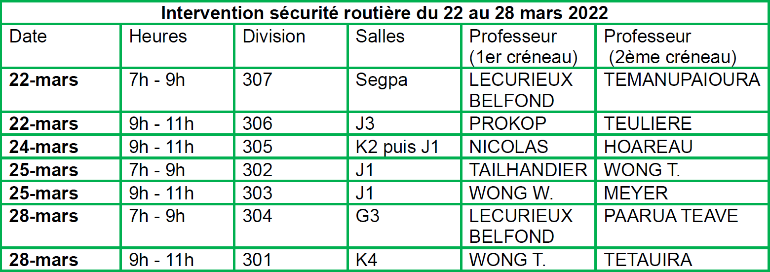 Lundi 14 / 03 de 07h00 à 14h30 : 501 / 502 / 503 (Tautira)