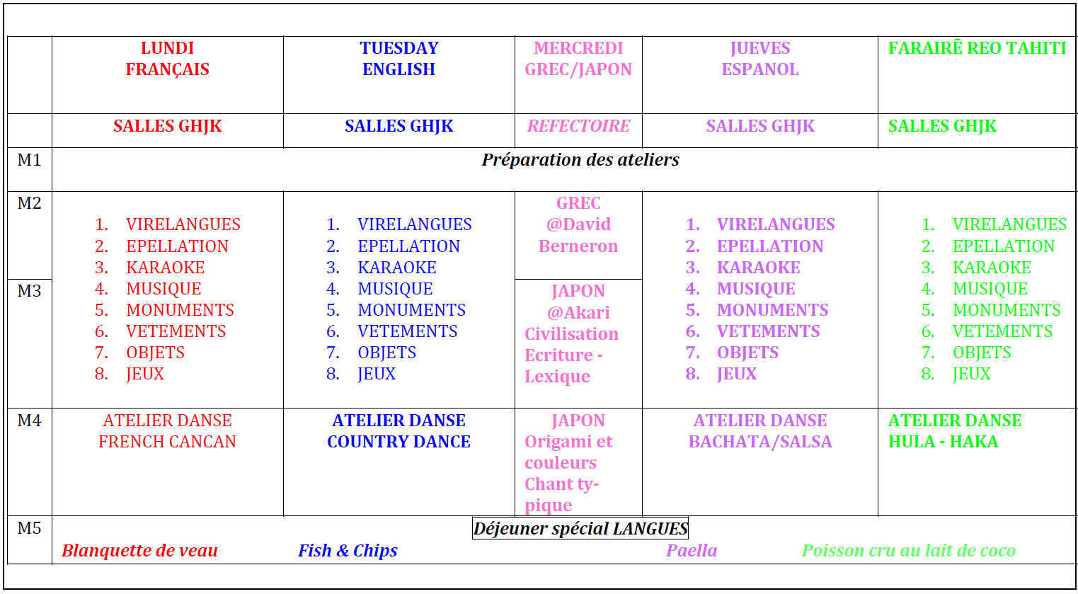 Chaque matinée est consacrée à une langue/culture et les enseignants animeront les ateliers linguistiques et culturels. Donc chaque enseignant animateur devra animer son atelier durant toute la semaine dans les différentes langues/cultures sauf si absence justifiée.